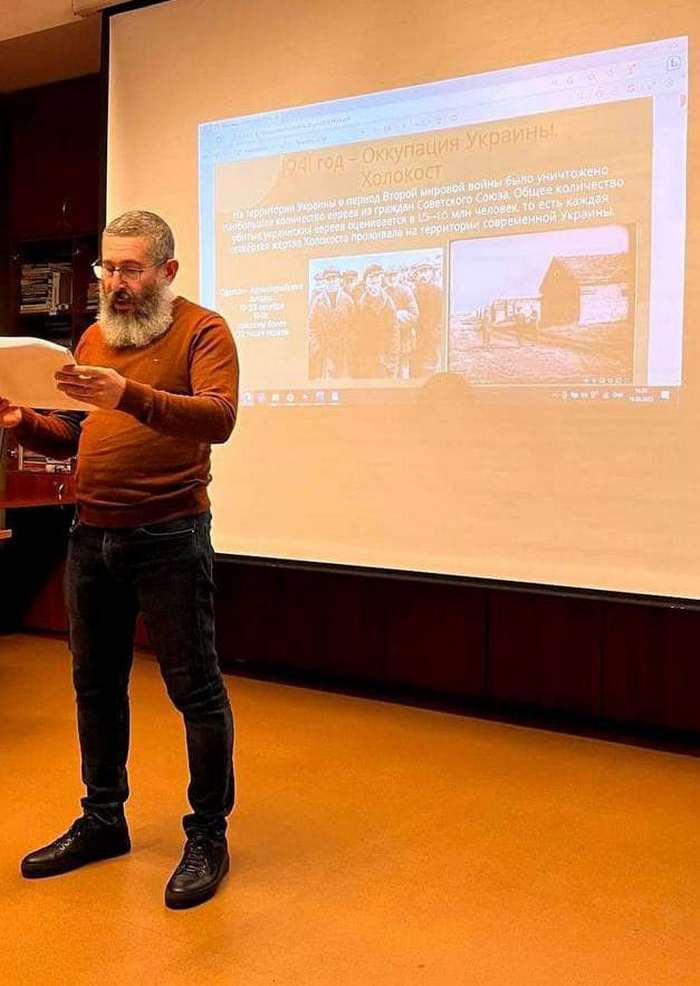 Head of the Board of Directors of the Odessky Holocaust Research Center Pavlo Kozlenko April 23, 2023 giving a lecture “Save the memory: how…