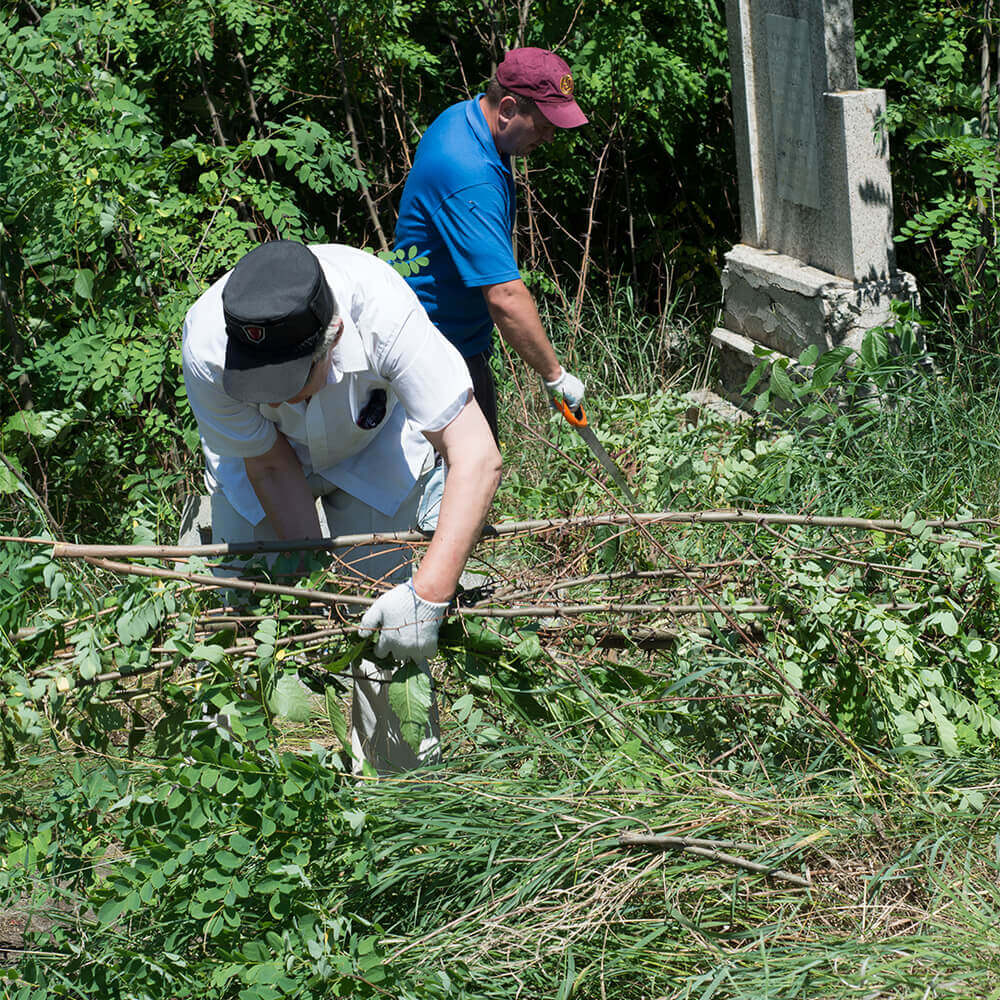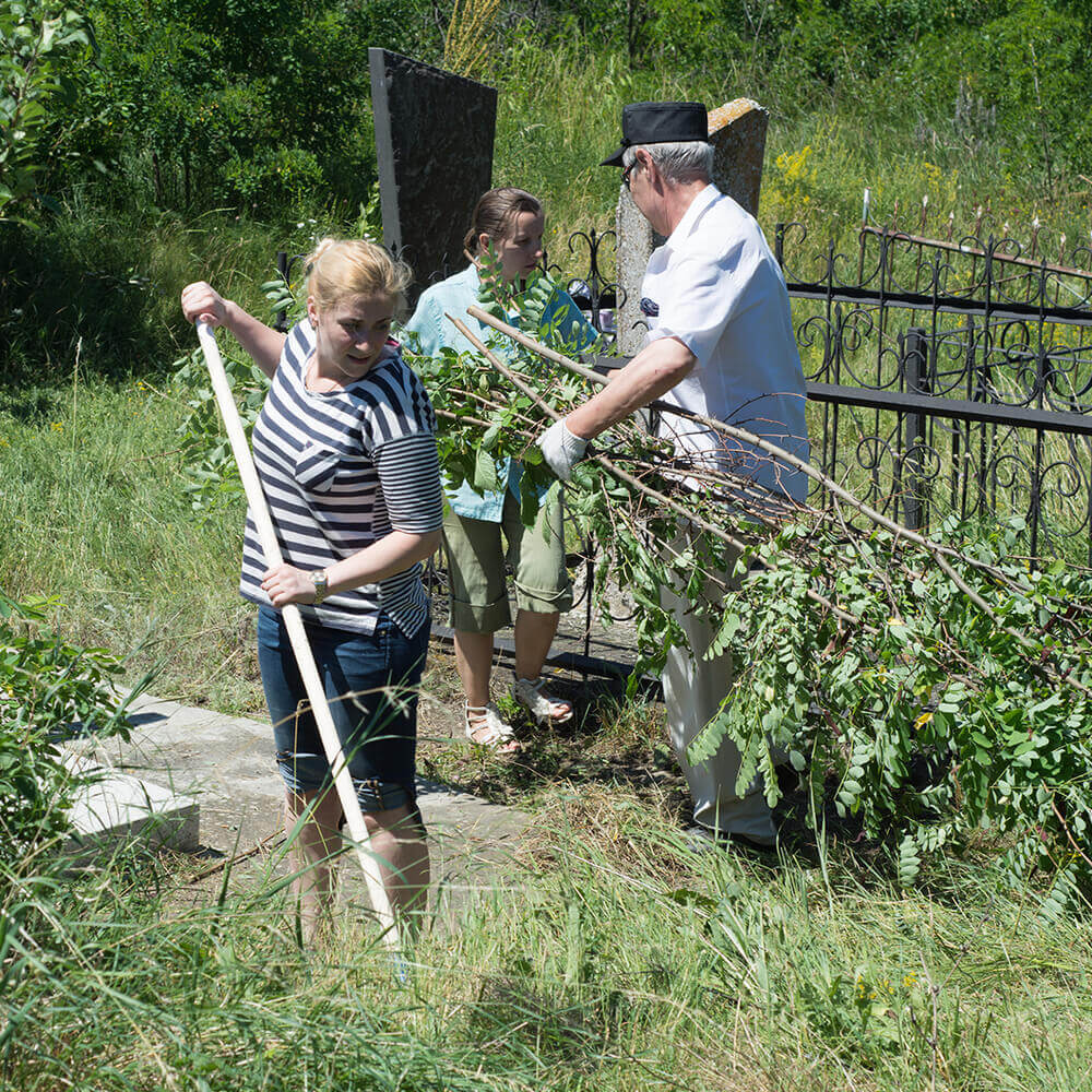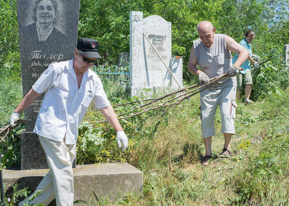 July 9, 2017. The League of Jewish Volunteering of the Jewish Community Center "Beit Grand" and the Foundation "In Memory of the Victims of Nazism" cleaned up the Jewish cemetery in Kodyma. They lifted fallen tombstones, removed debris, and cut down dry trees. After the cleaning, Raisa Markivna Koltman gave a tour for the youth. They also visited the Kodyma Museum of Local Lore.